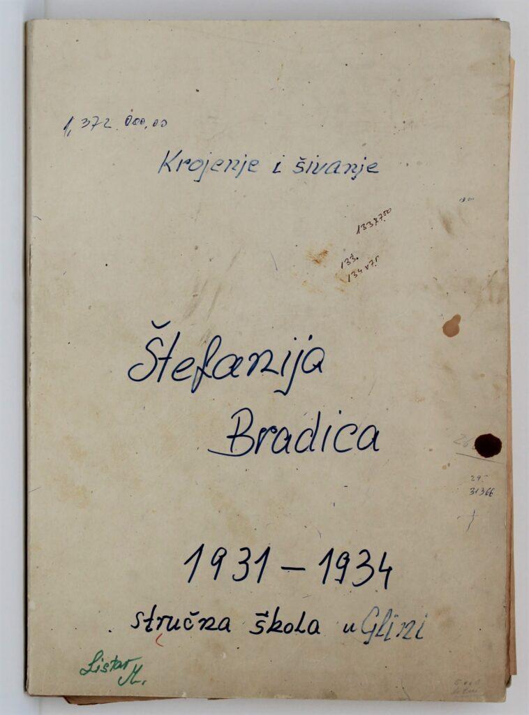 Možda i najljepši novopridošli predmet, otkupljen za Zbirku školstva, jest mapa skromnih korica, rad Štefanije Bradice, polaznice stručne škole u Glini (1931. – 1934.), a kasnije zaposlenice u karlovačkoj tekstilnoj industriji. Zapravo je vrlo malo poznato odnosno objavljeno o toj školi, pa je ovaj predmet pomogao da se Glina locira kao mjesto školovanja koje je utjecalo na razvoj tekstilne industrije. U korice su umetnuta četiri arka od kojih jedan nosi nadnevak proljeće godina 1931. i 32. Sadrže krojne arke za pojedine odjevne predmete, iscrtane olovkom i tintom, ali i modele od krep-papira u manjem mjerilu, izrađene vrlo delikatno. Na prvi pogled čini se da taj neveliki uzorak pridonosi uvidu u zanimljivu i kvalitetnu obrazovno-kulturnu praksu u kojoj se prepliću tradicijski elementi (zapravo inspiracija folklorom) i urbani stilovi.