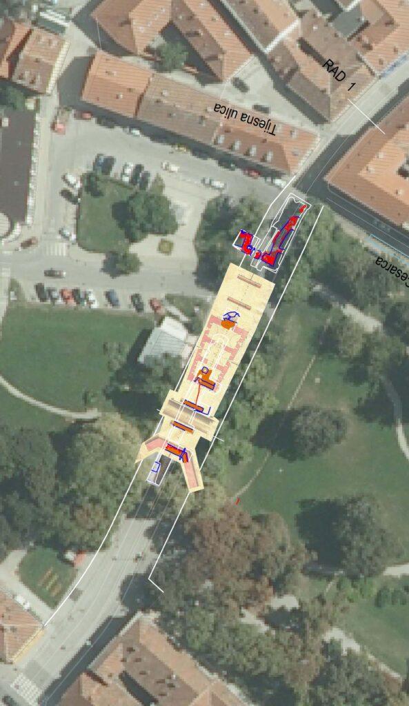 Krajem veljače krenuli smo u pravcu juga gdje smo pretpostavili postojanje mosta kojim se uz pomoć pokretnog dijela pristupalo vratima. Prema starim nacrtima most nosi šest nosača lučnog poprečnog presjeka kojima se pristiže na glasiju (vanjski prostor), pri čemu je vanjska kosina šanca (kontraskarpa) također podzidana opekom. Arheološki smo potvrdili postojanje nosača i „peraju“ odnosno završetak mosta koji je podudaran nacrtima. Grabe, odnosno šančevi zatrpavaju se nakon Drugog svjetskog rata i pretvaraju u parkovne površine.[3] Istraživanjima smo utvrdili da strukture mosta nisu rušene, već jednostavno zasipane.