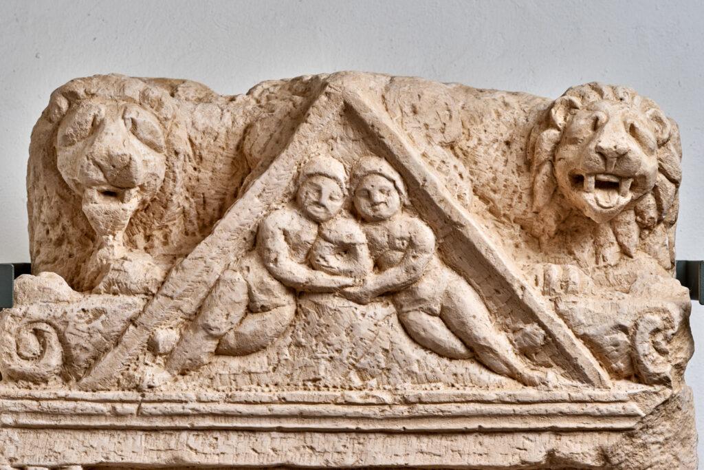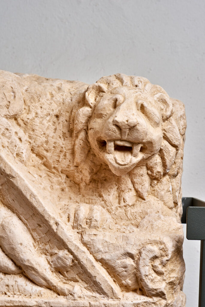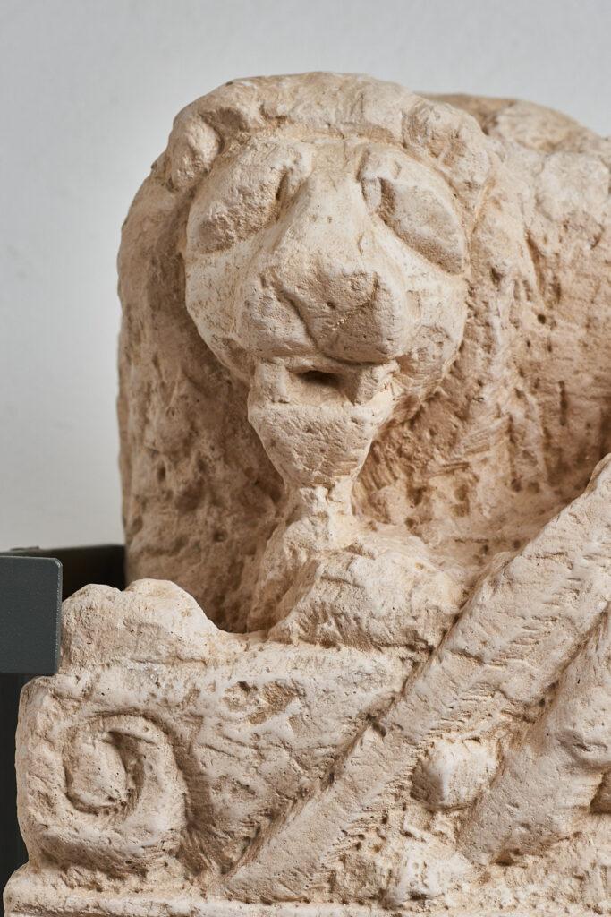 U karlovačkom lapidariju dvije lavlje glave krase bočne akroterije monumentalne stele iz Topuskog. Lavovi su, kao što je ranije navedeno, simbol besmrtnosti i kao takvi su nerijetko motivi na rimskim nadgrobnim spomenicima. Plastično oblikovane lavlje glave sa svake strane zatvaraju trokutasti zabat kojim stela završava. Lavlja griva oblikovana je realistično i energično s naborima koji pokazuju bujnu lavlju dlaku koja je personifikacija lavovske snage. Čeljust im je otvorena s naglašenim očnjacima i jezikom. Desni lav je nešto bolje sačuvan i oblikovan od lijevog.