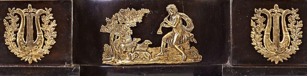 Egzotacija ne zahvaća sve elemente oblikovanja. Figurativno oblikovani metalni dijelovi na bazi, kao i dijelovi brojčanika, referiraju se na klasičnu starinu kao što je to uobičajeno na velikoj većini portalnih satova. Na bazi se pojavljuju motivi s žičanim i puhačkim instrumentima, unutar brojčanika krilati Amor (nedostaje još jedan?) oštri svoje strelice na brusnom kamenu. Naravno, ne treba pokušati izvoditi neke posebne zaključke iz usporednog pojavljivanja egzotičnih i klasičnih motiva, dovoljno je podsjetiti da je sat kao cjelina zapravo konfiguracija dijelova nabavljenih kod različitih proizvođača. Premda je ebanist uveo egzotične motive u svoju ponudu, izrađivač metalnih dijelova to nije učinio pa nije ni bilo moguće u potpunosti dati satu egzotični izgled.