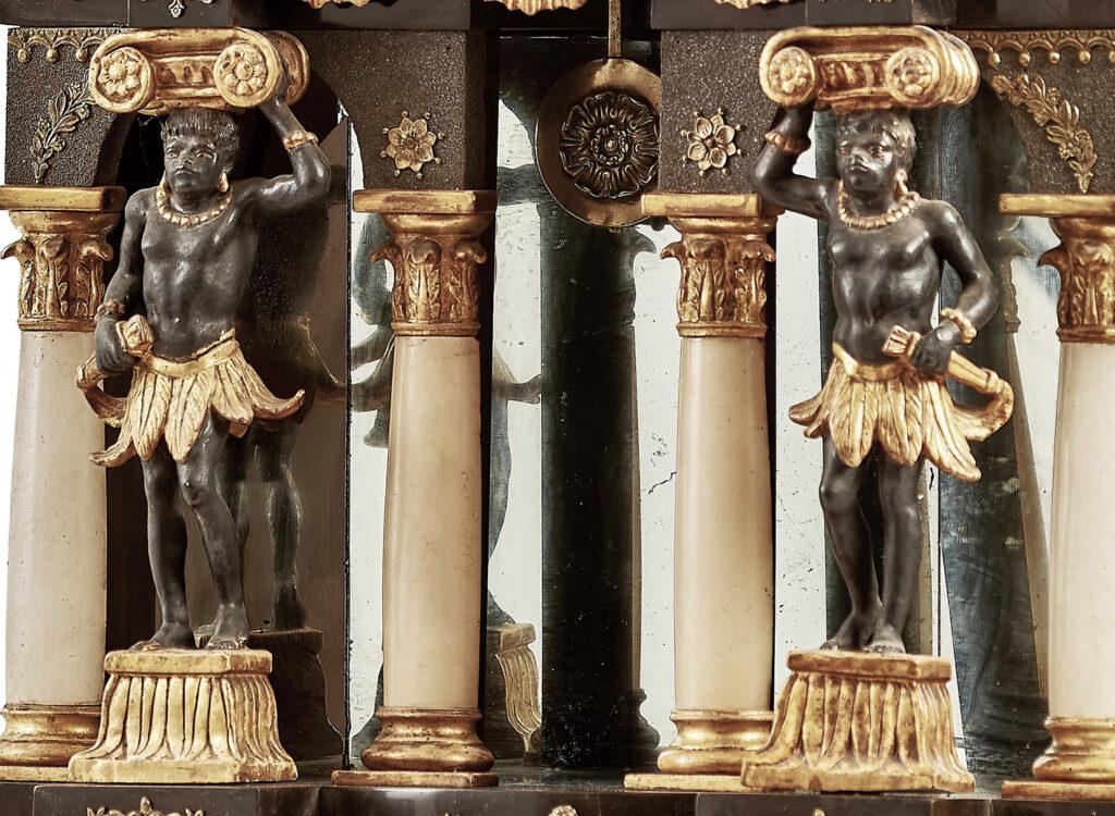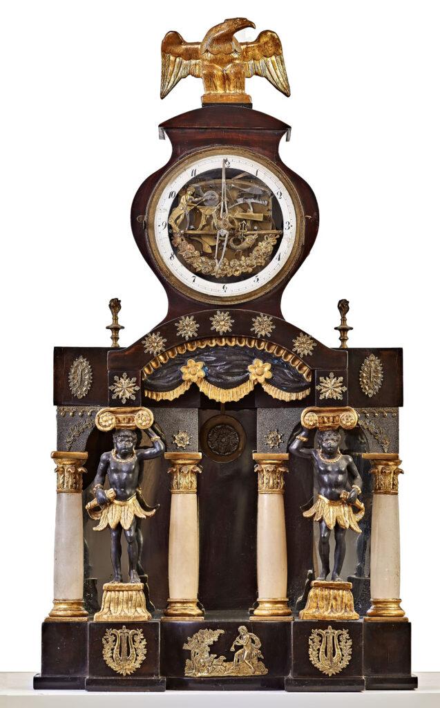 I dok su reljefni Apolon i Psiha omiljeni likovi u inscenaciji ovih profinjenih prizora za kućnu upotrebu, pronađe se i poneki tematski izlet u egzotične krajeve. Ovom prilikom ćemo skrenuti pažnju upravo na jednu rjeđu temu u oblikovanju kućišta. Javlja se na jednom satu iz karlovačke Zbirke ambijentalnih i priručnih tehnikalija, a proširuje ikonografski obzor ampira. Naime, imperijalno-kolonijalni interesi onovremenih Europljana protežu se na Afriku i druge tropske krajeve, a djelomično su artikulirani i kao kulturološki odnosno etnološki interes. Struktura ovog portala je egzoticirana pa trabeaciju nose tamnoputi atlanti u pregačama od palmina lišća. Očito je cjelokupna tema shvaćena kao bliska prirodi odnosno vegetaciji: atlanti stoje na bazama koje i same imaju motiv palmina lišća, na njihova tjemena se oslanjanu jonski kapiteli s utkanim cvjetnim motivima. Flankirajući stupovi imaju razlistale korintske kapitele (atlanti su središnji dio tročlane nosive strukture). Glavni motiv trabeacije je luk sa zastorima.