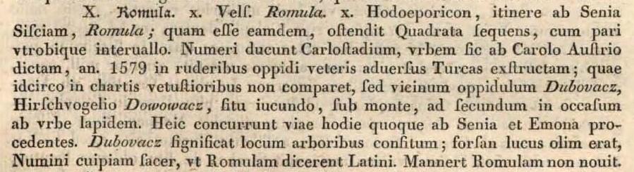 X. Romula. (…) Itinerer, putem od Senja prema Sisku, Romula; prikazana Quadrata u produžetku, s istim razmakom na obje strane. Brojevi vode do Karlovca, grada koji je nazvan po Karlu Austrijskom, izgrađen 1579. godine na ruševinama starog grada kako bi se suprotstavili Turcima; zbog toga se ne pojavljuje u starijim kartama, već se pojavljuje susjedno selo Dubovac, poznato kao Hirschvogeliov Dowowacz, a nalazi na ugodnom mjestu, pod brdom, oko dvije milje zapadno od grada. Ovdje se danas i dalje susreću ceste koje dolaze iz Senja i Ljubljane. Dubovac znači mjesto prekriveno drvećem – možda je nekada bio svetište posvećeno nekom božanstvu, kao što su Latini rekli: ‘Romula’. Mannert nije poznavao Romulu.