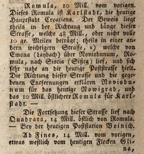 Romula, 10. milja od prethodne. Ova Romula je Karlovac, današnji glavni grad Hrvatske. Dokaz se nalazi djelomično u smjeru i duljini ove ceste, koja iznosi 48 milja ili ne punih 10 njemačkih milja; djelomično i na drugoj važnijoj cesti, koja je išla od Emone (Lanbach) preko Noviodunuma, Romule, do Siscie (Sisak), a držala se vrlo blizu današnje poštanske ceste. Smjer te ceste i navedene udaljenosti objašnjavaju Noviodunum kao današnji Novigrad i ovih 10 milja bližu Romula kao Karlovac. Nastavak te ceste vodio je prema Quadrati, 14 milja istočno od Romule, kod današnje poštanske stanice Vojnić. Ad Fines, 14 milja od prethodnog, nešto zapadno od današnjeg Gline, uz rijeku koja se ulijeva u Kupu.